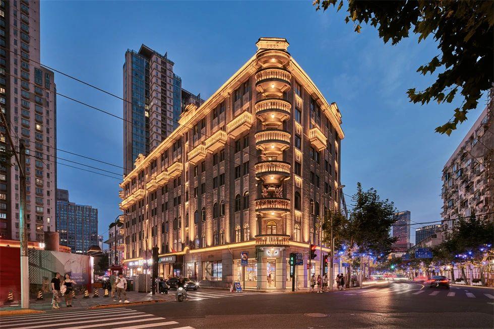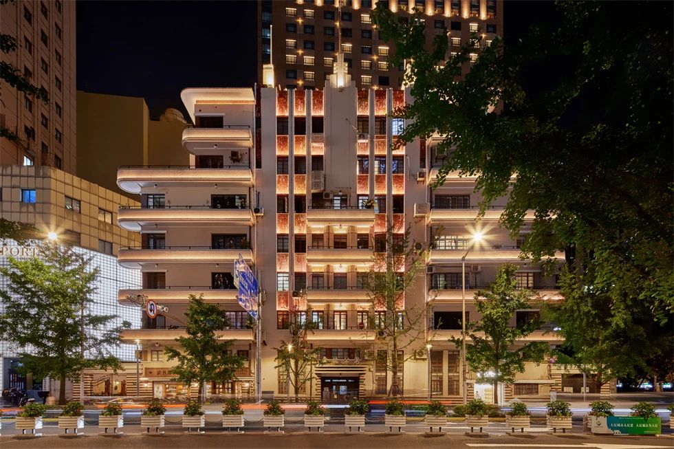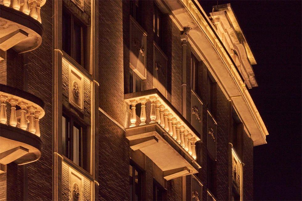 常德公寓為1936年竣工的裝飾藝術派風格建筑,夜景重點表現其東立面,層層向上的燈光富有節奏地烘托中部豎向線條,柔和升起的水平線性燈光優雅細膩地展現弧形伸展的陽臺,配合搖曳發光的裝飾燈,典雅低調,令人駐足。