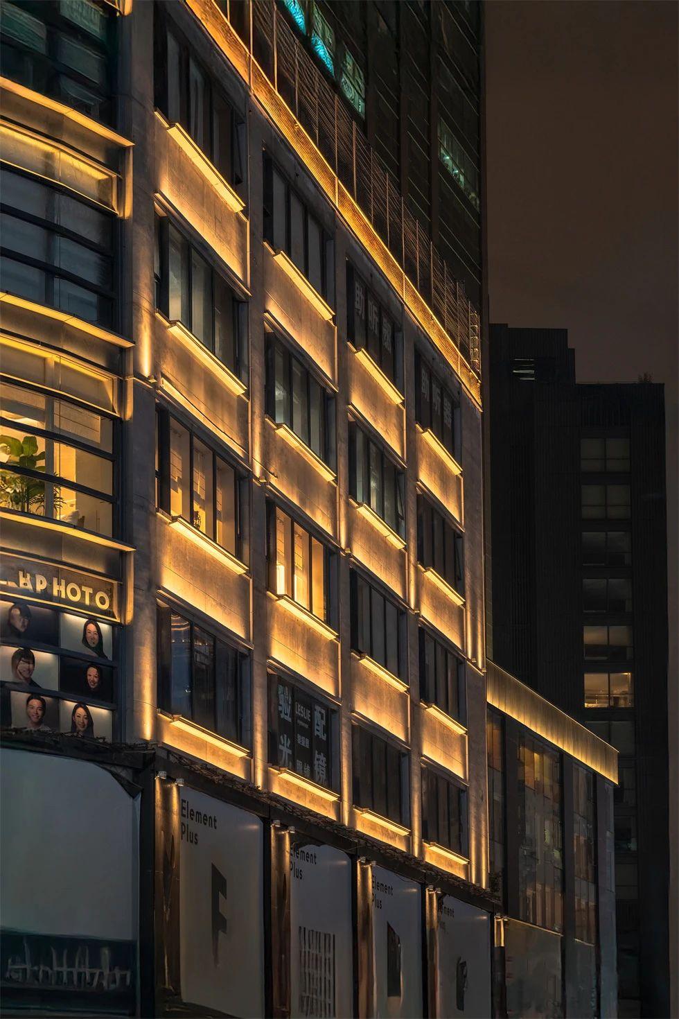五月花商務中心的燈光改造以“融入與點亮”為核心理念。通過精準的立面投光技術,建筑的結構肌理被清晰勾勒,冷白色調燈光與周邊歷史建筑的暖光形成巧妙對比,既保持了商業街區的整體協調性,又彰顯了現代建筑的簡約與活力。